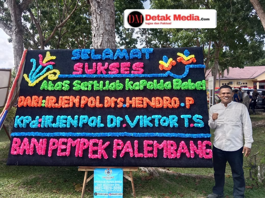 Dalam karangan bunganya tertulis selamat dan sukses atas sertijab Kapolda Babel dari Irjen Pol Hendro Pandowo kepada Irjen Pol Viktor T Sihombing dari Bani Pempek Palembang.
