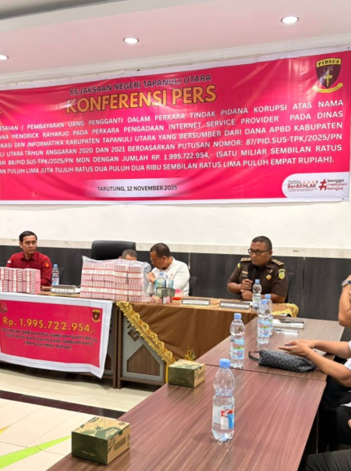 Pihak kejaksaan Negeri Tapanuli Utara, menerima uang pengganti tindak pidana korupsi, dalam perkara pengadaan Internet Servce Provider, Pada Dinas Kominfo Kabupaten Tapanuli Utara, tahun anggaran 2020 dan 2021, senilai Rp.1.995.722.954,- (satu miliar sembilan ratus sembilan puluh lima juta tujuh ratus dua puluh dua ribu sembilan ratus lima puluh empat rupiah), di Aula Kantor Kejaksaan Negeri Tapanuli Utara, Rabu (12/11).