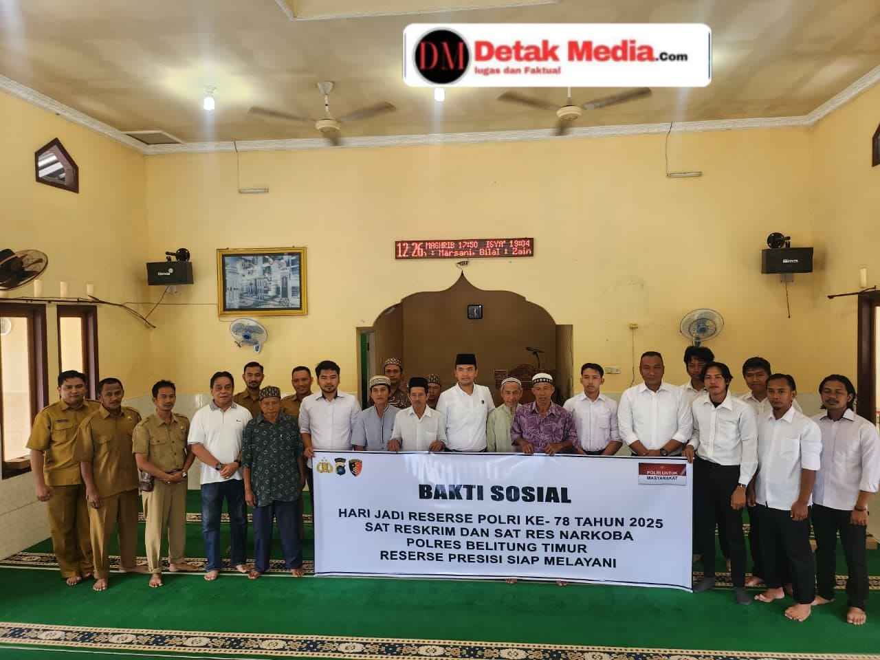 Dalam rangka memperingati Hari Jadi Fungsi Reserse ke-78, Satreskrim dan Satresnarkoba Polres Belitung Timur melaksanakan kegiatan Doa Bersama dan Bakti Sosial pada Senin, 8 Desember 2025, bertempat di Masjid Ar-Rahman, Dusun Manggarawan, Desa Padang, Kecamatan Manggar, Kabupaten Belitung Timur.